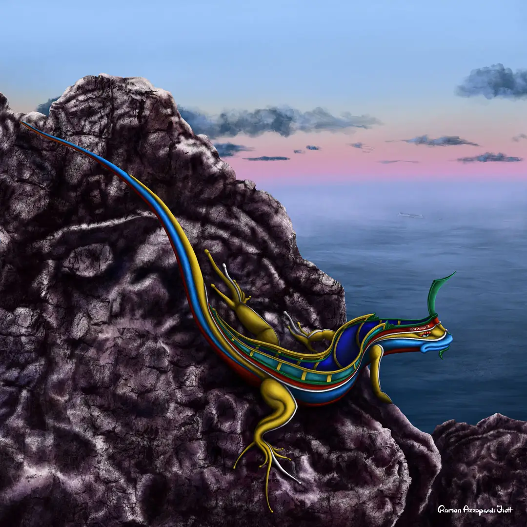 Blending two iconic symbols, “GremxuLuzzu” combines the filfola lizard (gremxula ta’ Filfa) and the traditional fishing boat called the luzzu. Lizards are a familiar sight on the islands, but the subspecies Podarcis filfolensis ssp. Filfolensis holds a special place as it is unique to the captivating islet of Filfla, located near Dingli Cliffs. The artwork features this stunning backdrop, providing a glimpse into the extraordinary ecosystem of Filfla.